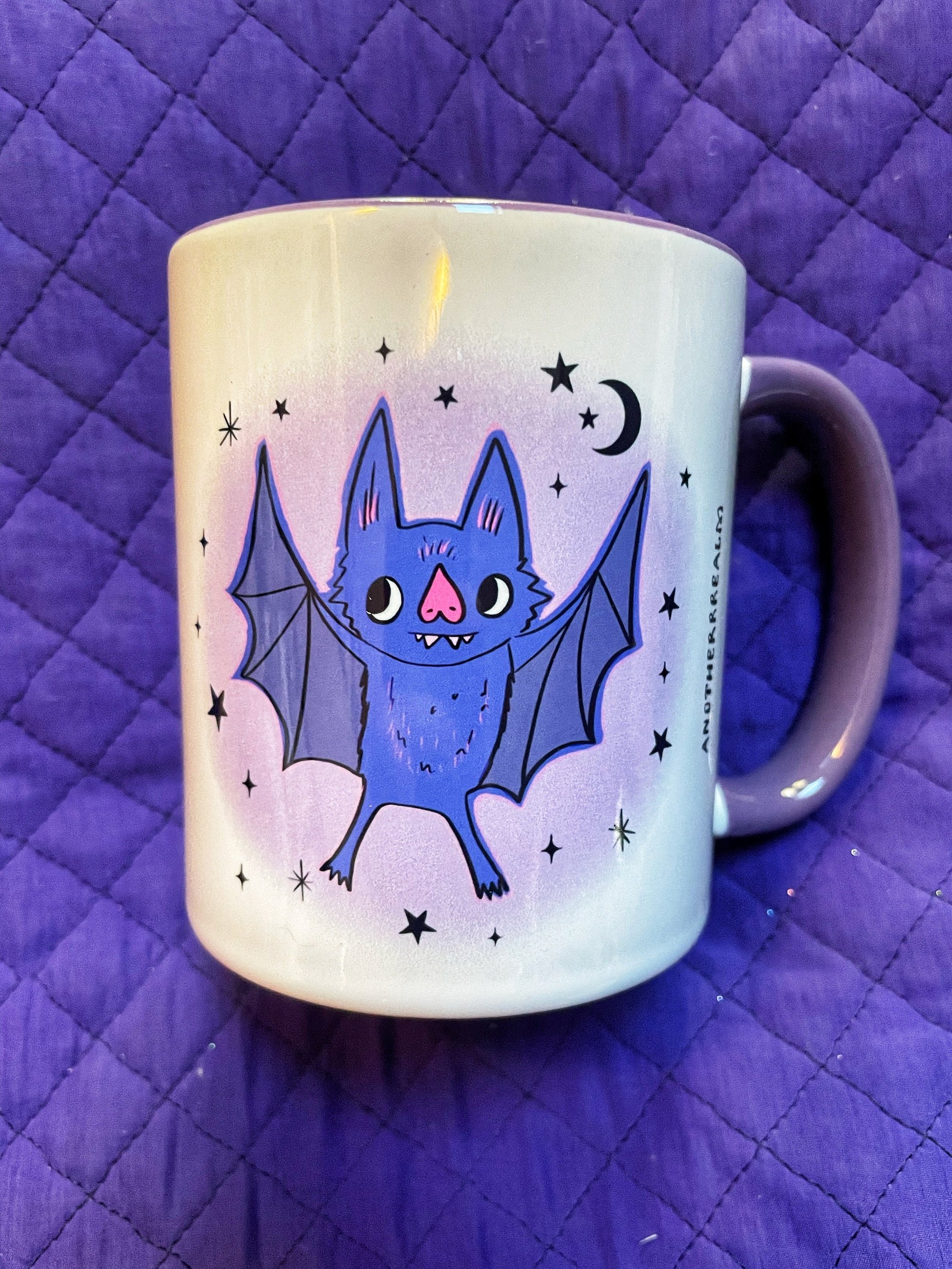 Bat! Go batty for this spoopy mug, designed and sublimation printed by me onto a rather fetching purple handle /inner mug.