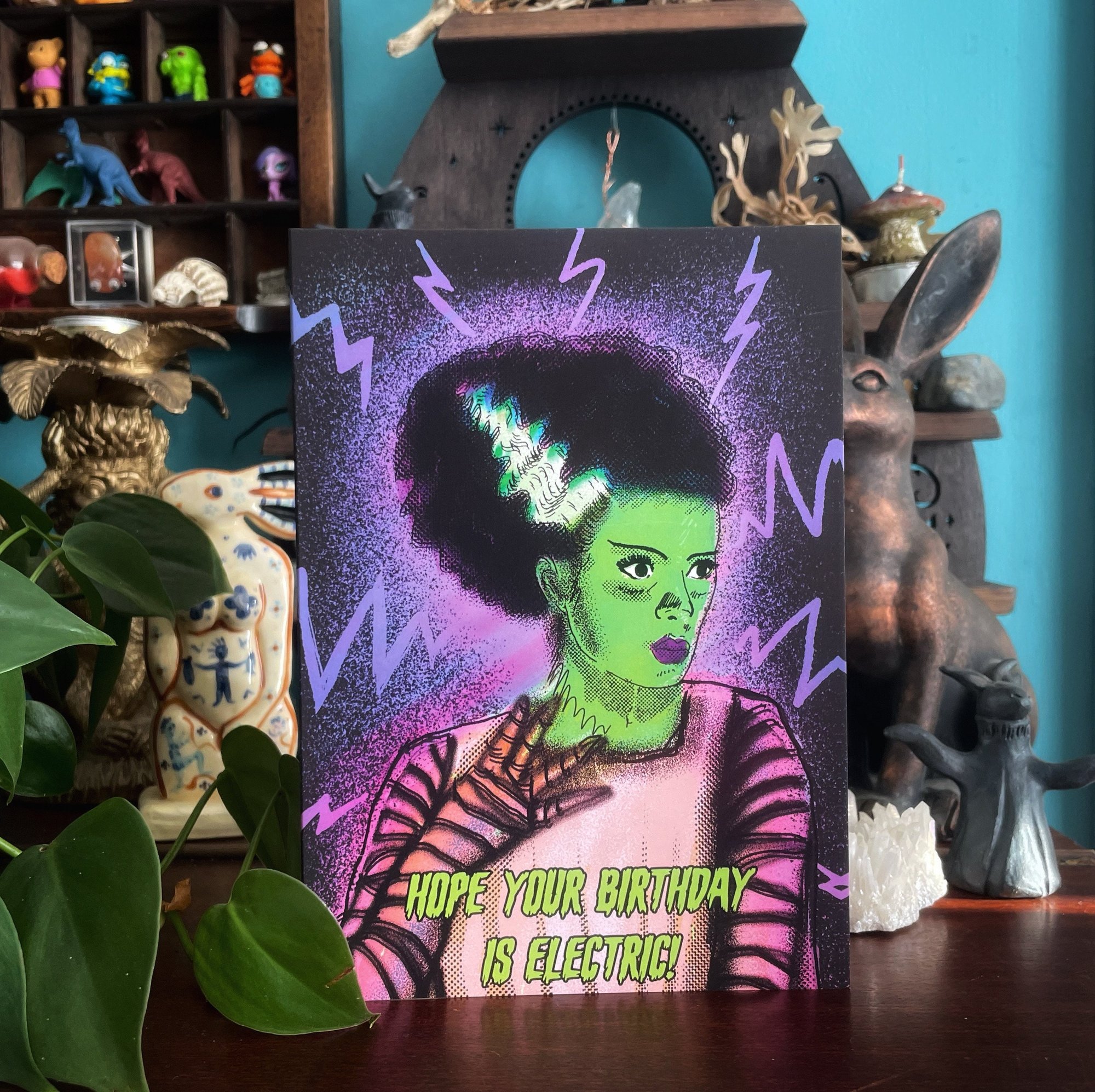 Bride of Frankenstein inspired birthday card for classic horror-loving fans, monstrous mates and electric or even eclectic beings!