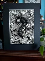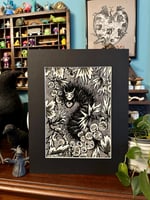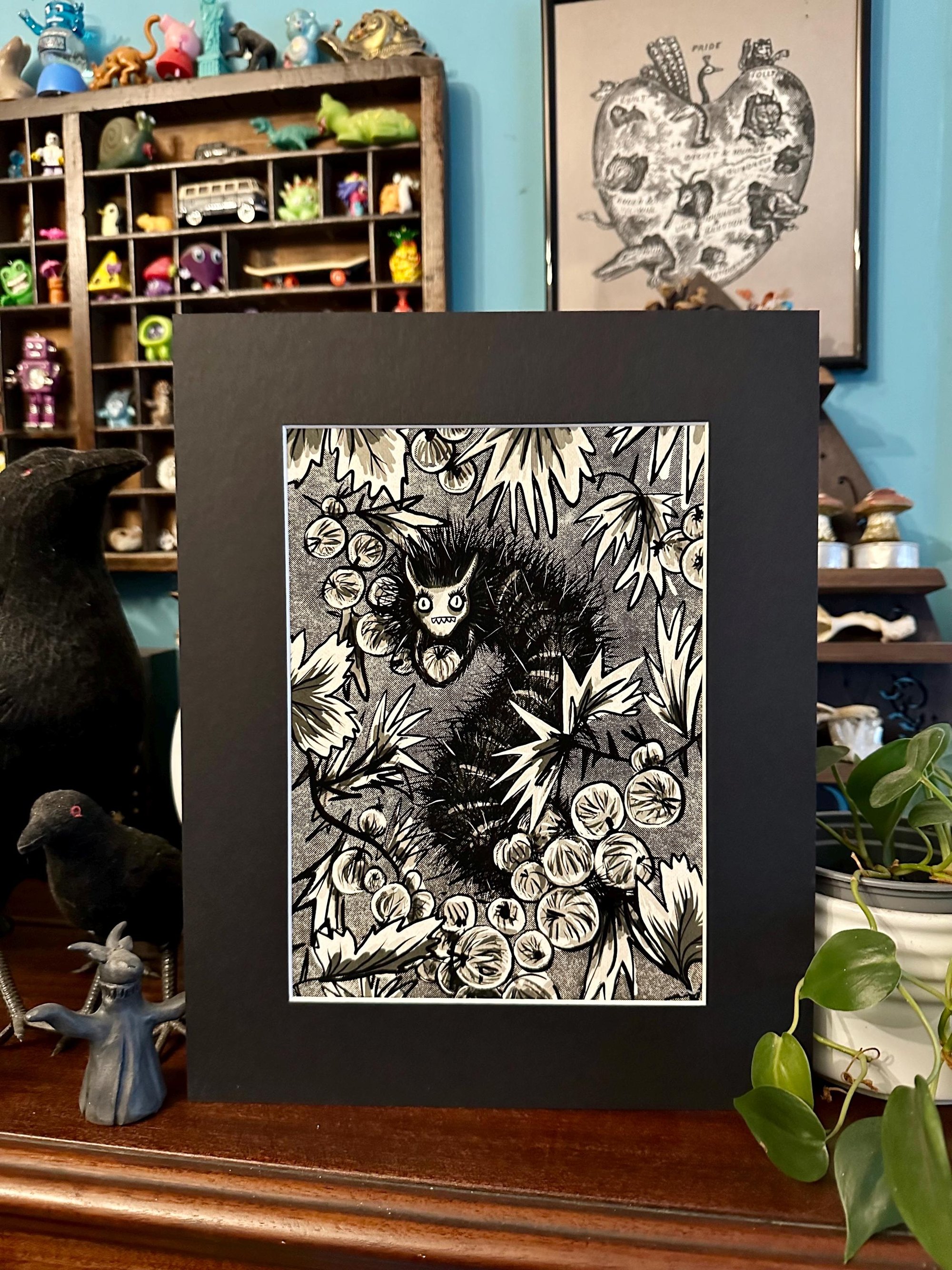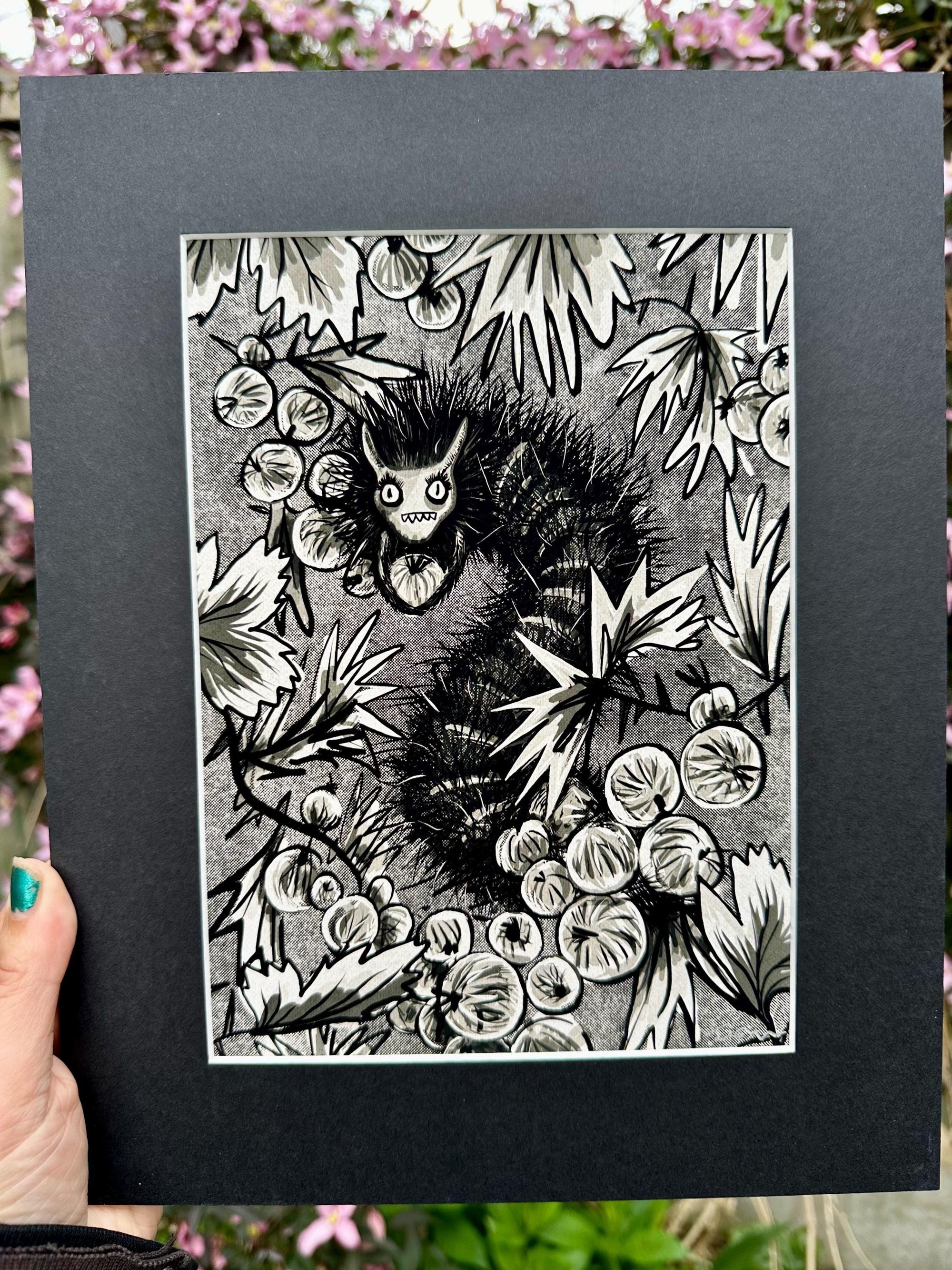 Giclee print using archival inks on a velvet etching paper, comes with a standard size black white-core mount, ready for framing.