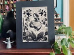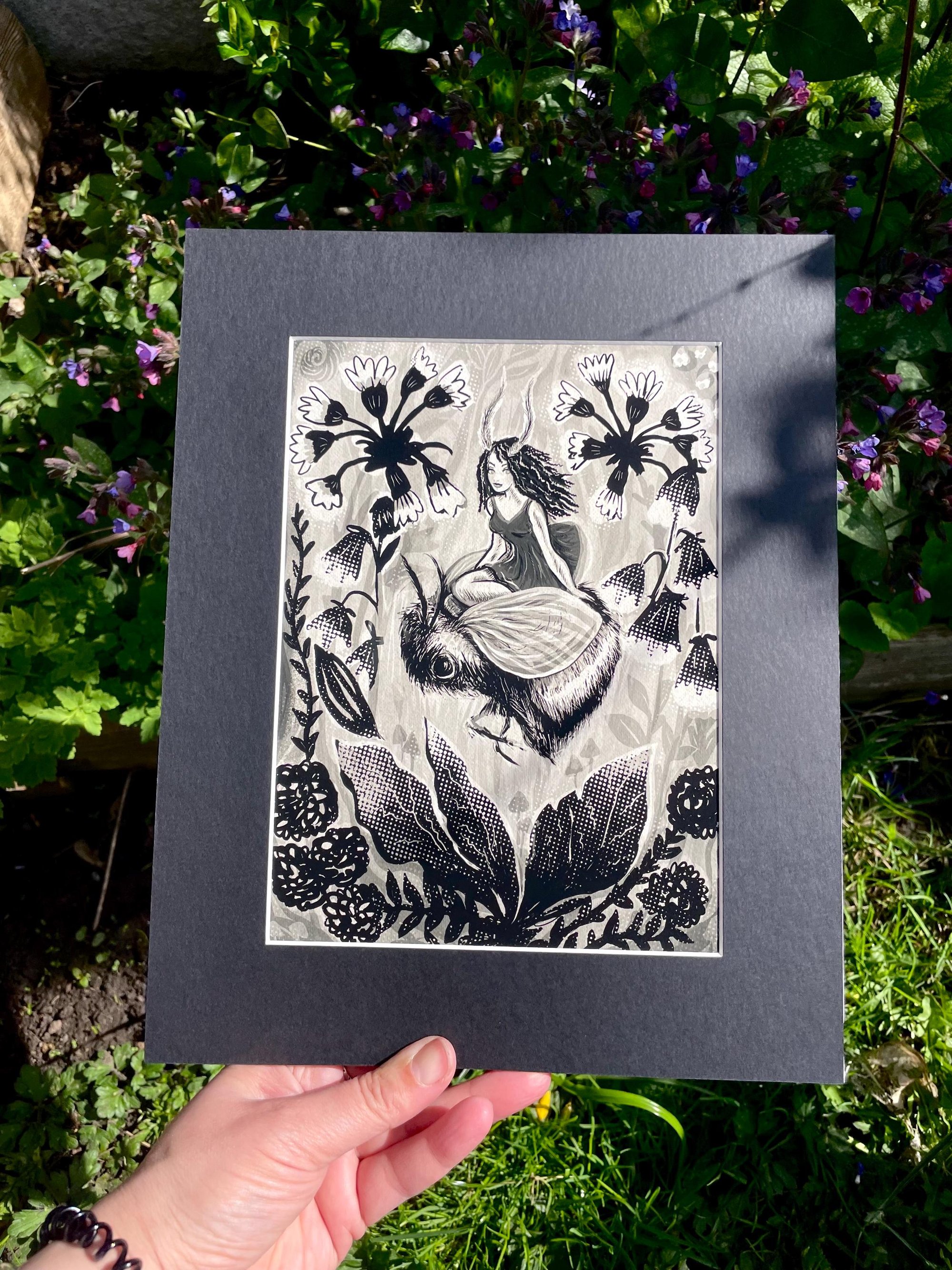 Giclee print using archival inks on a velvet etching paper, comes with a standard size black white-core mount, ready for framing.